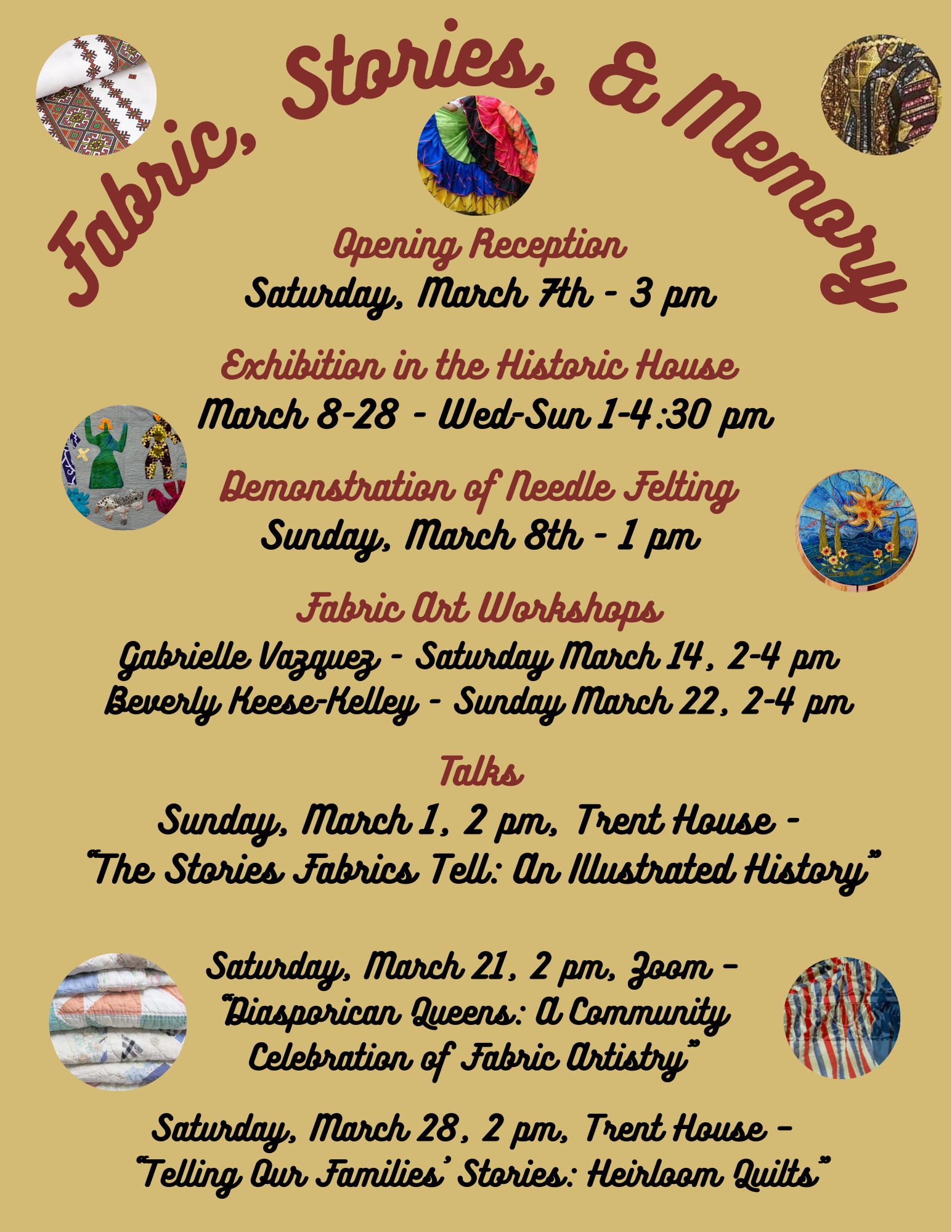 • Saturday, March 7, 2026, at 3 pm: Fabric, Stories, & Memory exhibition opening