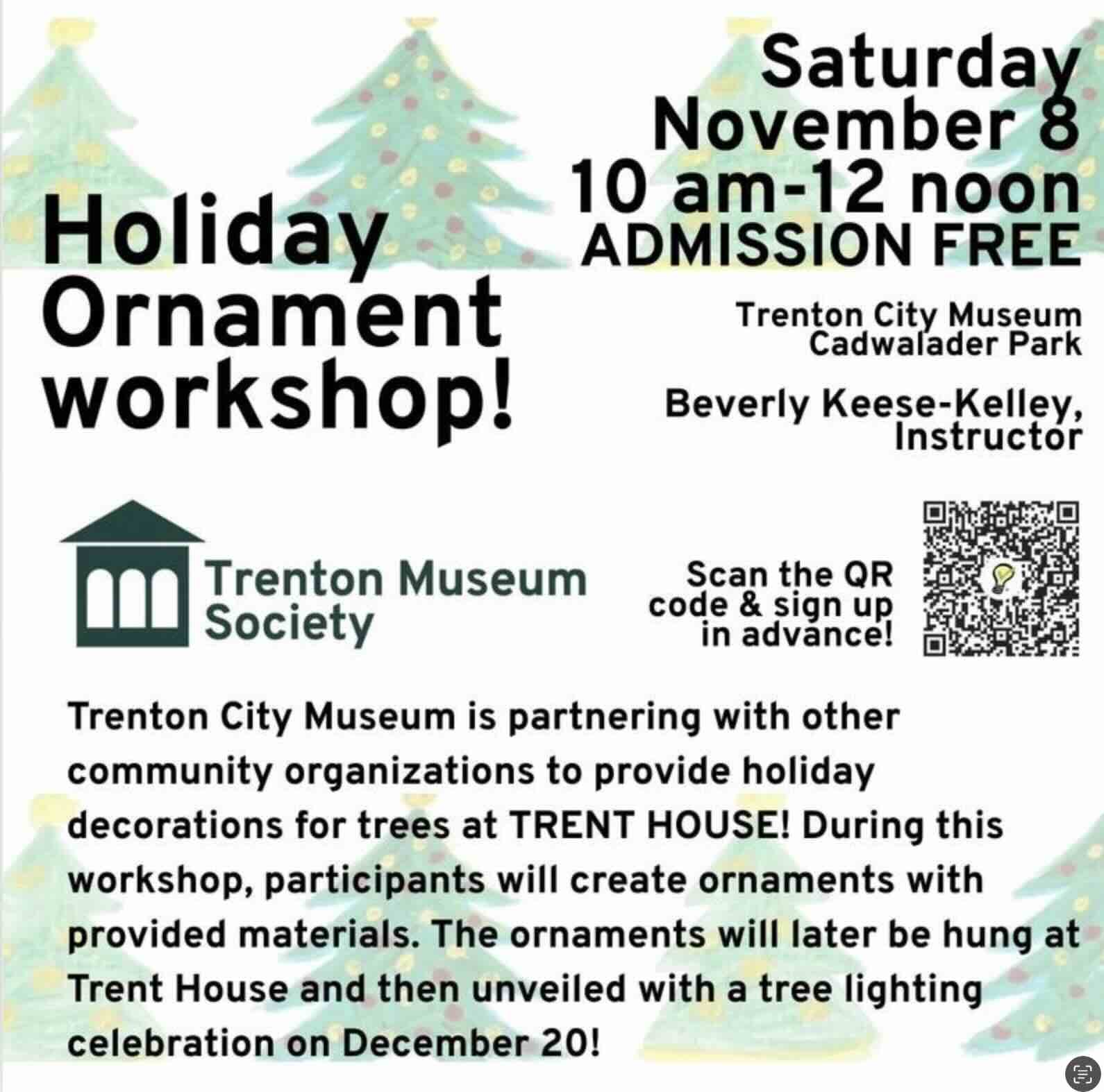Let’s get into the holiday spirit! Trenton City Museum is partnering with other community organizations to decorate holiday heritage trees at Trent House! During this workshop for families and kids, participants will create ornaments that will later be hung at Trent House and then unveiled with a special tree lighting celebration on December 20! All materials provided.